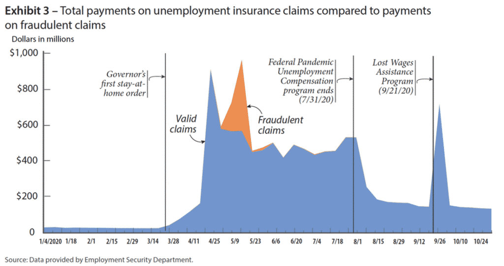 Example: The Washington State Auditor published a report on unemployment benefit programs and how delays and improper payments happened throughout the pandemic. This report details how stolen personal information was sold online enabling fraudsters to steal unemployment insurance dollars, and how unemployment specialists were overwhelmed with requests for assistance at the start of the pandemic. The report’s recommendations cover ways to better combat fraud and improve customer service with improved detection of suspicious claims and hiring more staff to help improve service access. The agency responded and thanked the auditor for its collaborative approach.